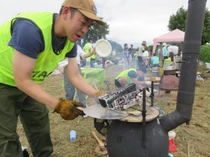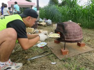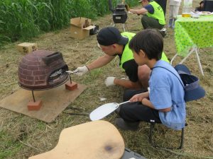 こちらはピザ作り。ピザ生地に具をトッピング。畑の里芋とネギものせます。そして、ピザ窯へ! 窯担当はボランティアのパパや若手スタッフ。次々においしそうにピザを焼いてくれました。