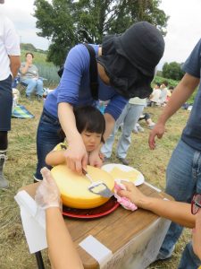 この会のもう1つのおたのしみ。今年も野澤組さまより丸ごとゴーダチーズをご提供いただき、チーズ削り体験ができました。ふだんなかなか触れたことのない大きなチーズ。