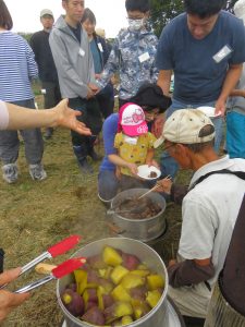 こちらでは島田さんが、育てた里芋とさつま芋を蒸かしてくださり、ホクホクお芋の試食です。素材を味わい、とてもおいしかったです!
