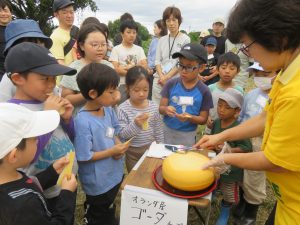 松成代表からチーズのひみつを色々教えてもらいながら、大人も子どももけずる体験を楽しみました。そのまま食べてみたり、スープやピザにのせてみたり、味は最高です!!